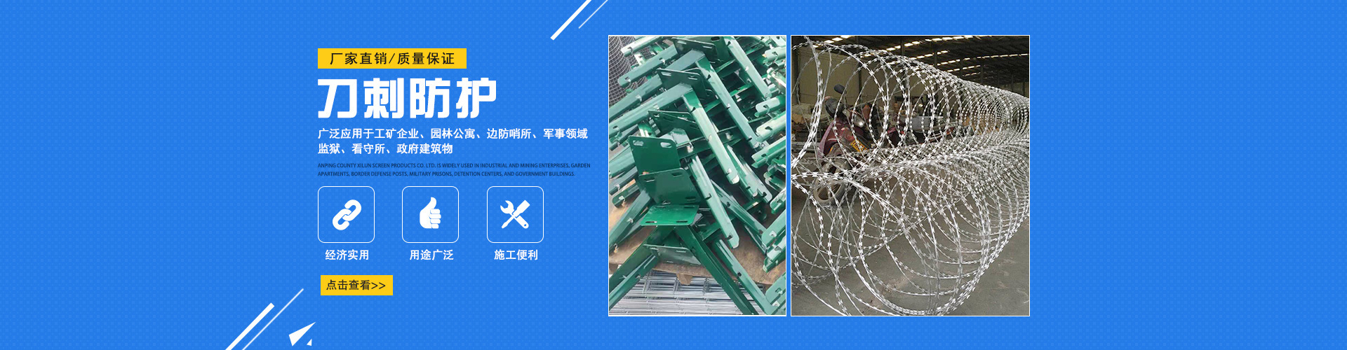 安平初日絲網(wǎng)有限公司主要產(chǎn)品有刀片刺繩、刺絲滾籠、刺繩支架、護(hù)欄網(wǎng)、隔離網(wǎng)、球場(chǎng)圍網(wǎng)等多種產(chǎn)品,公司擁有先進(jìn)的生產(chǎn)設(shè)備和技術(shù),以“質(zhì)量求生存,信譽(yù)謀發(fā)展”為生產(chǎn)原則,為新老用戶提供高質(zhì)量產(chǎn)品。